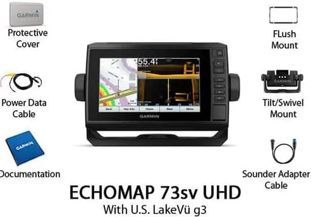 Box: ECHOMAP UHD 73sv with LakeV g3 for U. S. 8-pin transducer to 12-pin sounder adapter cablePower/data cableTilt/swivel mount with quick release cradleFlush mountProtective coverHardwareDocumentationWARNING: Cancer and Reproductive Harm - www. P65Warnings. ca. gov.