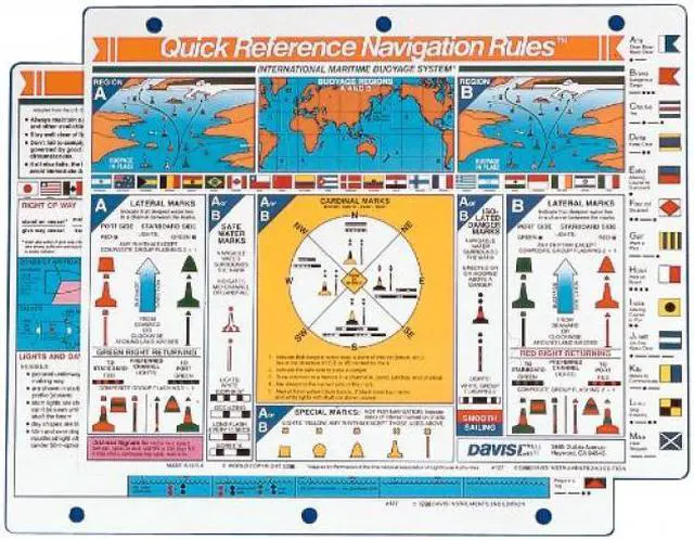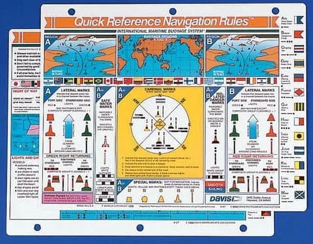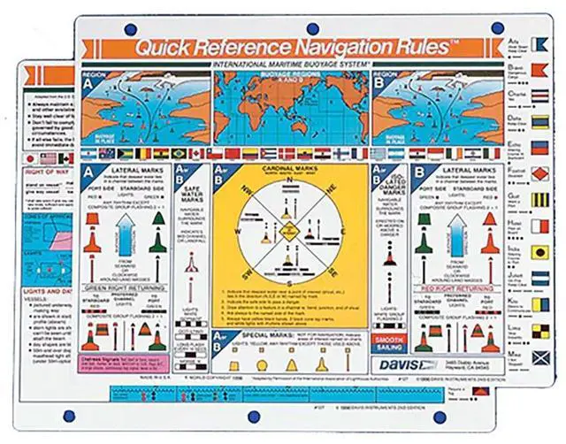 A comprehensive guide incorporating the International Maritime Buoyage System and COLREGS. Clarifies differences between Cardinal and Lateral buoyage systems and buoyage regions, key to reducing confusion and danger when entering unfamiliar waters or busy harbors. Complete details on right-of-way, sound signals, entering and clearing a foreign port, lights and day shapes, collision prevention procedures, signal flags.