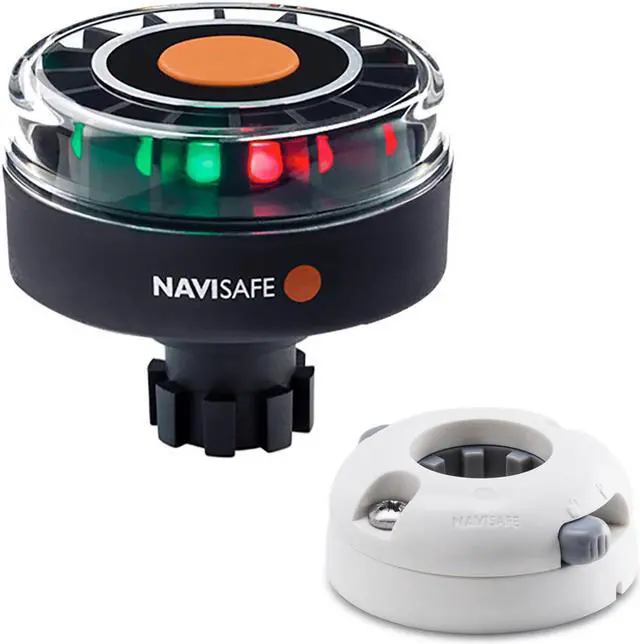 Navilight Tricolor 2NM w/Navibolt Base Horizontal Mount - White. Portable Tricolor Navilight with Navibolt base, compatible with Navisafe Navimount system. This is an extremely durable and strong solution. This is a very low and tight mounting solution together with the any of the Navimount. Technical Specifications: US Coast Guard approved for 2 nautical miles. 5 Modes: Tricolor Masthead light (135x white, 112,5x red, 112,5x green), BiColor side light, red side light, green side light, white Sternlight. Floats light facing up. Submersible to 20M/66 feet . Corrosion resistant. Powered by three AAA batteries (not included). Navimount Horizontal - White. The Navimount Horizontal is designed to attach the Navimount Pole or the Navilights with Navimount base (model 040, 340) to horizontal surfaces - e. g. the boat deck or cabin roof. Includes: Horizontal Mount. Two self tapping stainless steel screws.