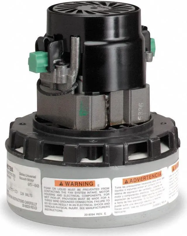 Vacuum Motor, Single Phase, Motor Design Universal AC/DC, Nameplate RPM 26, 330 RPM, No. of Speeds 1, 120V AC Voltage, Full Load Amps 11.0 A, Non-Standard Frame, Motor/Blower Type Bypass, Max. Amps 7 A, 60/50 Hz Hz, Motor Thermal Protection None, Ins. Class A, Max. Ambient Temp. 40 Degrees C, Duty Cycle Intermittent, Motor Enclosure Design Open, Motor Mounting Type Lug, Motor Mounting Position All Angle, Max. Air Watts 387 W, Vacuum Rating 107.1, CFM @ 2-In.