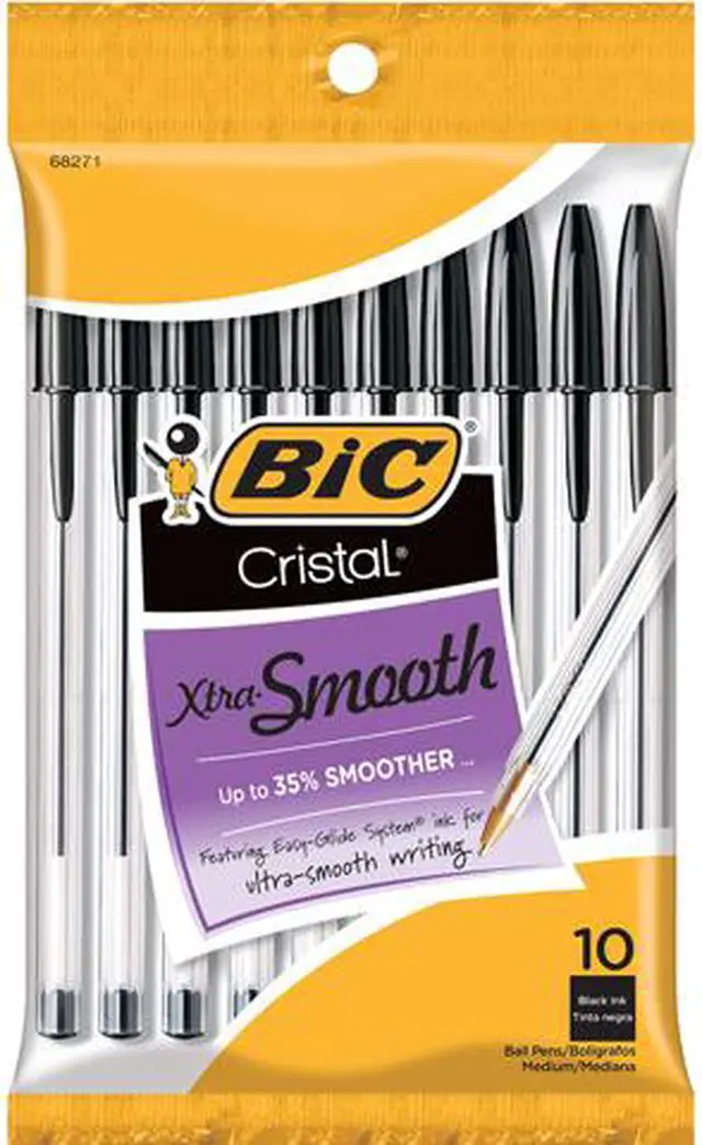 10pk blk cristal pen. 10-pack. Medium point. The classic ball point pen - standard issue in millions of homes and offices around the world. Clear barrel for visible ink supply and roll-proof hexagonal design. Ink Color: Black, Point Size: Medium, Pkg Qty: 10, Package Type: Hang Tag No. MSP101BE: Ink Color: Blue, Point Size: Medium, Pkg Qty: 10, Package Type: Hang Tag