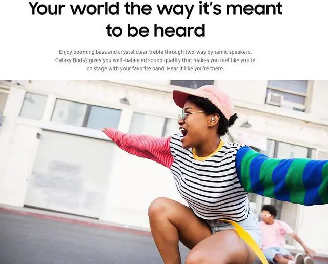 Get lost in what you love. Galaxy Buds2 opens a new world of sound with well-balanced audio, lightweight comfort fit, Active Noise Cancellation, and seamless connectivity to your phone and watch. Intuitive controls and powerful ANC keep you immersed when working out, gaming, or jamming to your beats. Enjoy booming bass and crystal clear treble through two-way dynamic speakers. Galaxy Buds2 gives you well-balanced sound quality that makes you feel like you're on stage with your favorite band. Hear it like you’re there. Two microphones detect ambient noise while Active Noise Cancellation blocks unwanted sound to keep you fully immersed in your music, games, audiobooks, and your favorite podcasts.