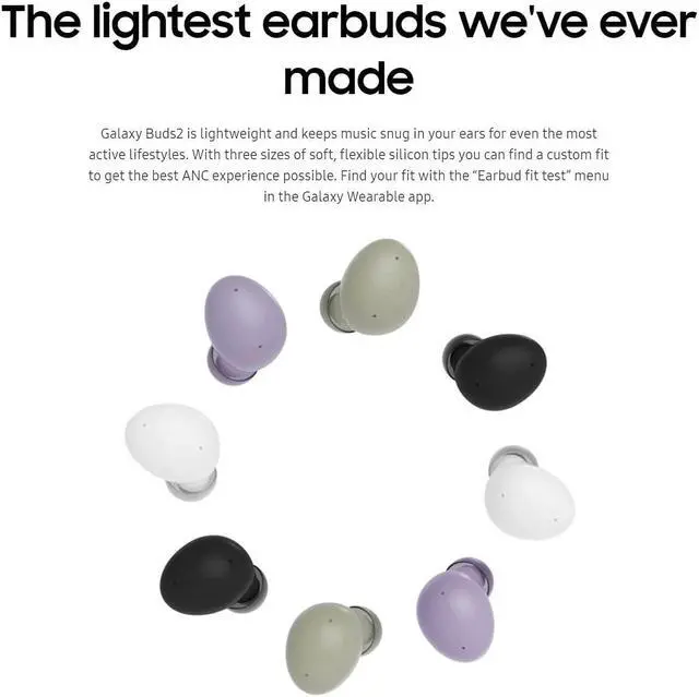 Galaxy Buds2 is lightweight and keeps music snug in your ears for even the most active lifestyles. With three sizes of soft, flexible silicon tips you can find a custom fit to get the best ANC experience possible. Find your fit with the “Earbud fit test” menu in the Galaxy Wearable app. With three microphones, a curved design to cut down on wind noise, and a machine-learning based solution to filter unwanted sound, Galaxy Buds2 is designed to deliver — and send — every word crisply and clearly, whether you're chatting with a friend or leading a high-stakes conference call.
