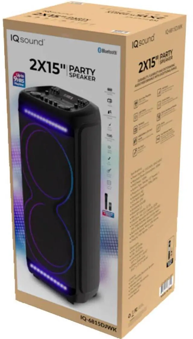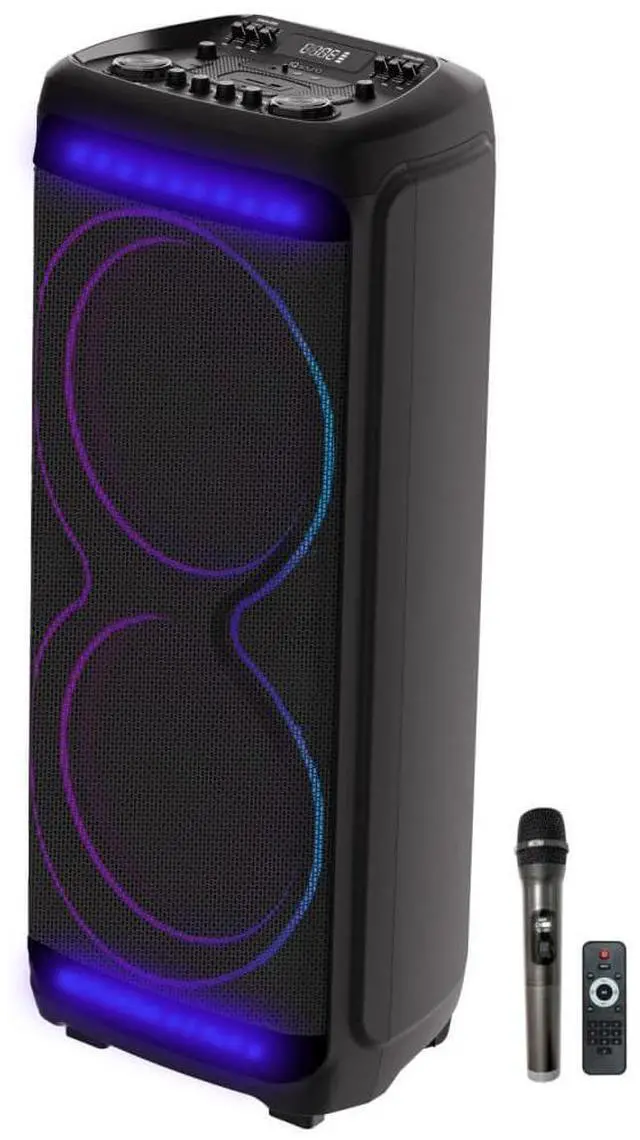 This rechargeable party speaker can keep the fun going for up to 9 hours. LED light effects and the included wireless microphone, as well as the guitar input, means you can get more involved with the sound. The speaker offers the ability to play music via Bluetooth 5.3, FM radio, guitar input, USB, microSD, or AUX for ultimate versatility.