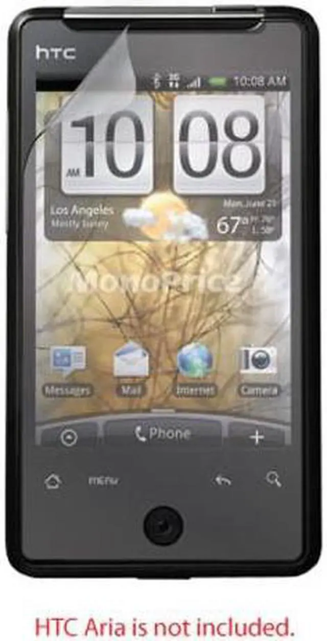 Protect the screen on your HTC Aria from scratches and fingermarks with a Monoprice protective screen film. This screen protector is sized to perfectly fit your HTC Aria and comes with a Matte finish, which reduces glare and reflections, yet allows the full spectrum of colors to shine through in all their original glory.While the film will adhere to the screen, it will not leave any resins or residue when removed. The packaging includes a lint-free cleaning cloth, to ensure that the screen is clean before applying the film, and an installation card, to help remove any small air bubbles that may occur during application.HTC Aria not included! Get the most out of your HTC Aria with Monoprice accessories! You might also consider:Micro USB cables for data sync and charging2600mAh universal External backup battery7800mAh universal External backup batteryEarphones to enjoy your music and multimedia in privateBlack folding speaker dock to fill your room with music