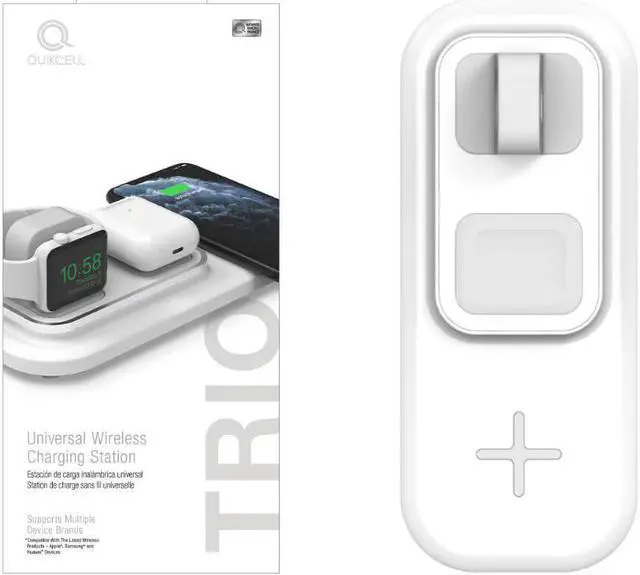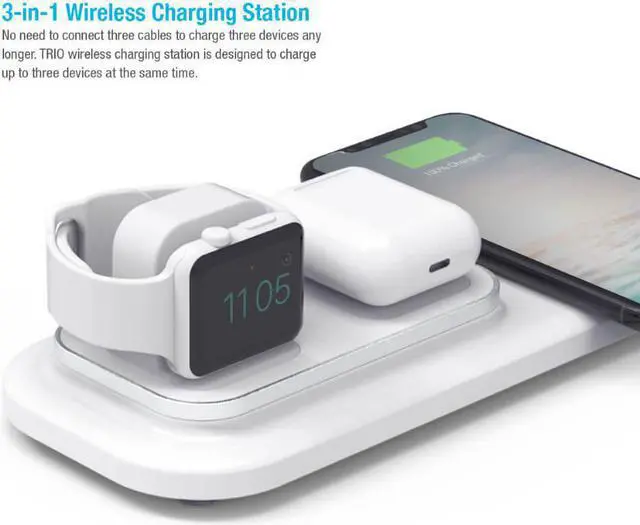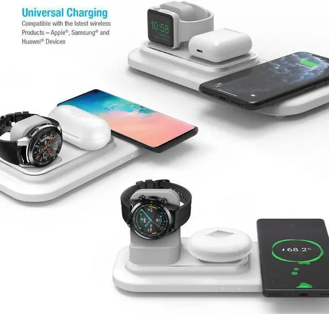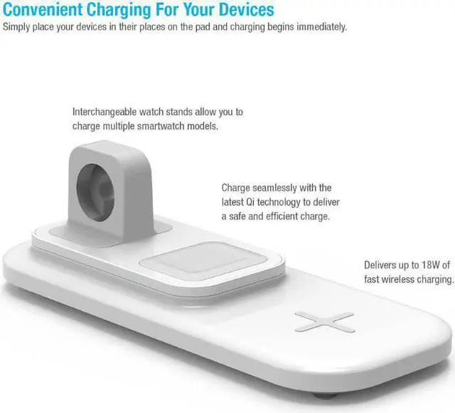 3-in-1 Wireless Charging Station Charge your smartphone, smartwatch, and wireless headphones charging case simultaneously Drop and Charge Simply place your devices in their places on the pad and charging begins immediately Qi-Certified Wireless Charging Works seamlessly with the latest Qi technology to deliver a safe and efficient charge Innovative Design Supports Multiple Smartwatch Models Interchangeable charging stand allows you the convenience and flexibility to charge multiple compatible smartwatch models (compatible with the latest wireless products-Samsung, Apple, and Huawei) Fast Charge Your Devices Delivers up to 18W of fast wireless charging Fully protected against overcharge, overcurrent, overvoltage, and high temperature Stylish Smart Design Keep your nightstand or desk tidy and neat