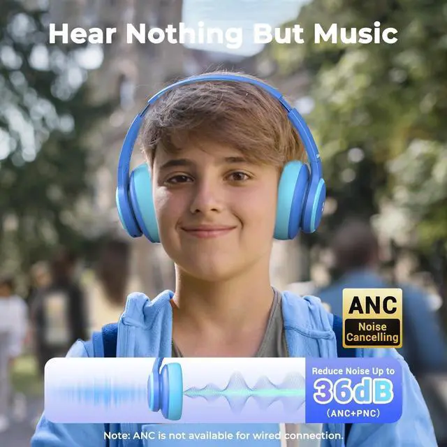 [Advanced Noise Reduction Technology]: Our Kids Bluetooth Headphones reduce up to 36dB of background noise (ANC+PNC), creating a quieter space for focused learning or play. With thoughtful voice prompts, kids can easily switch between noise-cancelling and standard modes by a simple press of the ANC button. (Note: ANC is not available for wired connection.)