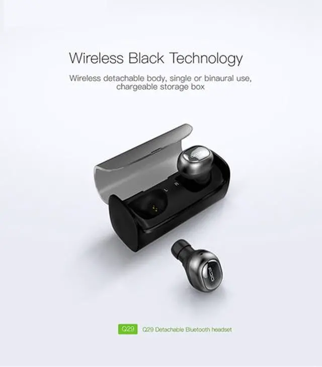 QCY Q29 Gemini bluetooth headset Features: 1. mini binaural bluetooth headset, easy to carry! 2. Bring your own seat charger, and put it in the box to recharge the headset automatically! 3. Earphones can be separately used separately