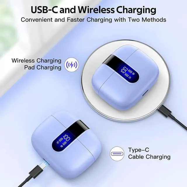 IPX5 Waterproof and Wireless Charging: The charging case of these bluetooth earbuds support wireless charging and USB C cable charging. These wireless headphones are rating at IPX5 waterproof, the nano-coating on earbuds surface can prevent water and sweat from penetrating, which can use as sport wireless headsets. You can listen to the music while running, working, reading, sleeping, meeting, etc.