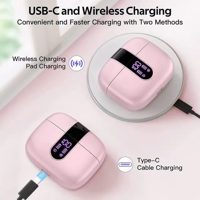 IPX5 Waterproof and Wireless Charging: The charging case of these bluetooth earbuds support wireless charging and USB C cable charging. These wireless headphones are rating at IPX5 waterproof, the nano-coating on earbuds surface can prevent water and sweat from penetrating, which can use as sport wireless headsets. You can listen to the music while running, working, reading, sleeping, meeting, etc.