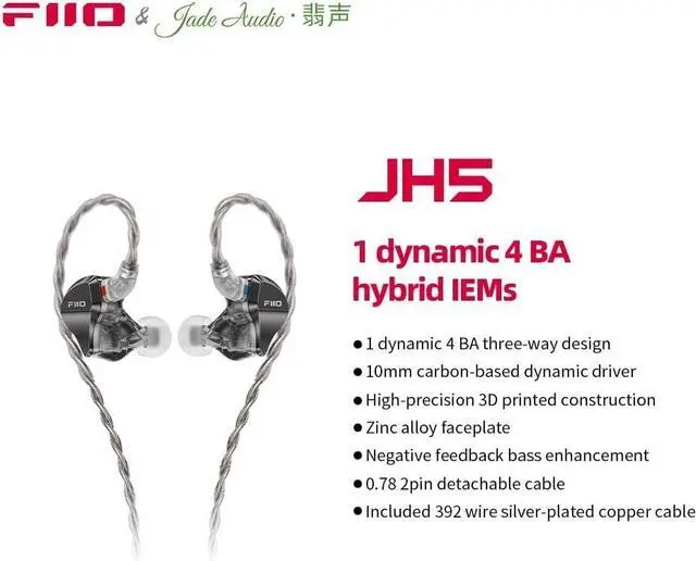 Higher performance: With the goal of presenting music from genres as diverse as classical to pop all in a high-fidelity manner, JH5 is a 10mm carbon-based dynamic driver which is seamlessly connected to the custom balanced armature drivers covering medium to ultra-high frequencies thanks to the drivers being separated into three independent chambers.The FIIO JH5 is truly an affordable IEM with a highly precise sound that truly lets you experience how good dynamic-BA hybrids can get.