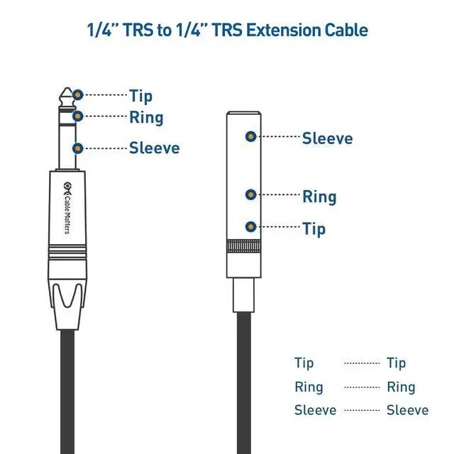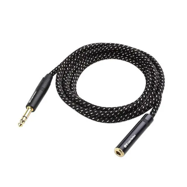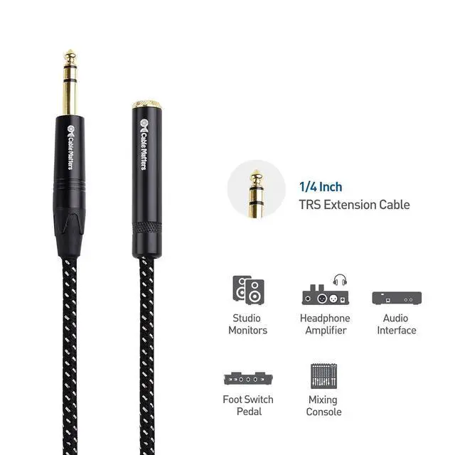 Extend the reach of your pro audio gear with the Cable Matters 6.35 mm Extension Cable; Audio extension cable 1/4 inch boosts the length of a 6.35 mm audio cableThe 6.35 mm headphone extension cable features a 1/4 inch Male and 1/4 inch female connector designed to boost the length of 1/4 inch audio cables; Connect your gear further with a boostThe 6.35 mm connector also known as a 1/4 inch connector or stereo audio connector is commonly used in professional audio gear including hi-fi headphones amplifiers A/V receivers and stereosHeadphone extension cable 1/4 inch features a 3-pole TRS connector on each end; 1/4 inch extension cable is compatible with stereo audio and balanced audio applicationsThe 1/4 inch headphone extension cable features a braided cable jacket for durability and tangle prevention and over-molded strain relief for increased durability