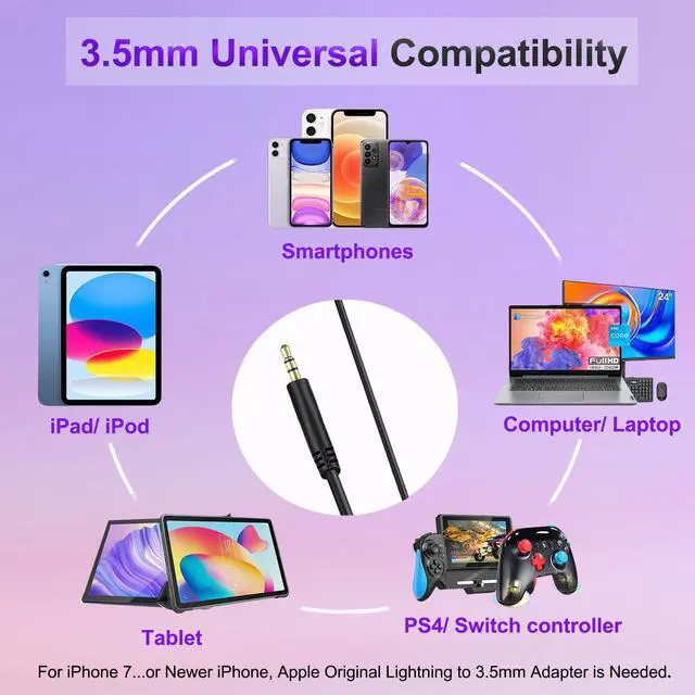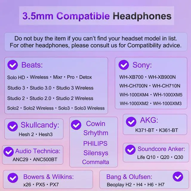 ? Headphones Compatibility This 3.5 mm audio cable is ONLY compatible with Beats by Dr Dre Headphones Solo3 Solo2 Studio3 Studio 2 Studio 2.0 Studio 3.0 Wireless HD Pro Mixr Detox Sony WH-1000XM5 WH-1000XM4 WH-1000XM3 WH-CH710N WH-CH720N WH-CH700N WH-1000XM WH-XB910N Skullcandy Audio Technica Soundcore AKG PHILIPS Wireless Headphones and more other headsets with a 3.5MM jack port listed in the description.? Universal Compatible DevicesCompatible with iPhone most smart phones and Computer Laptop PC Mac iPad iPod Tablet PS4/PS5/Xbox/Switch controller with single 3.5 mm audio jack( For iPhone 7... or Newer iPhone Original Lightning to 3.5 mm Adapter is Needed; for Xbox Original Headset Adapter is also Needed).