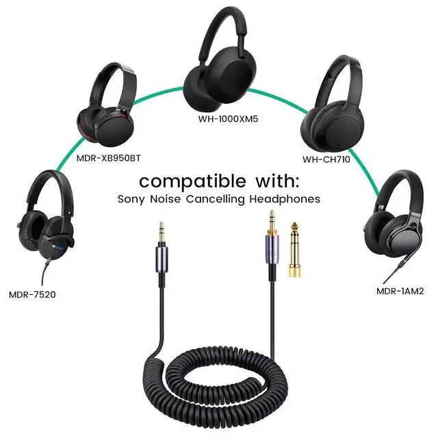 Compatible with Sony Noise Cancelling Headphones ULT WEAR WH1000XM6 WH1000XM5 WH1000XM4 WH1000XM3 WH1000XM2 WHCH710N WHCH720N MDR950BT MDR1AM2 MDR 75203.5 mm(1/8) 3 poles (TRS) male plug to 3.5 mm(1/8) 3 poles (TRS) male plug with 6.35 mm(1/4) adapter; Twist-lock and gold-plated tips make better connection ensure pure and transparent sound quality support sound-noise cancellationPremium PVC and copper wire conveniently using in studio mixing and tracking DJing FOH mastering post production personal listeningWorks with PS4 PS5 Switch Xbox One Xbox X/S MP3 players Laptops PC Cellphones Tablets Guitar Amplifier and other devices with 3.5 mm and 6.35 mm port interfaceApprox.