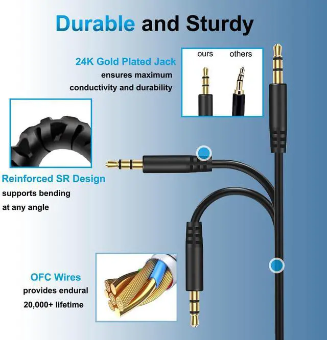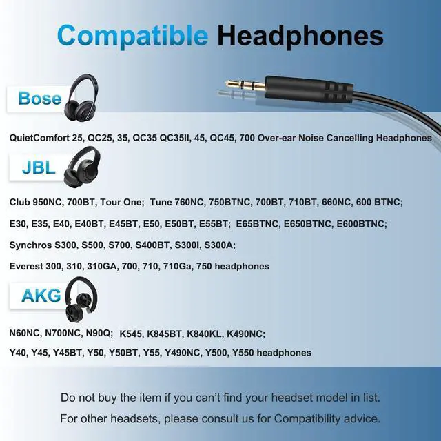 Perfect Length & Easy to UseThis 2.5 mm to 3.5 mm auxiliary audio straight cable Length 4.99 ft/152cm not easy to knot and easy to carry. Plug and play fit perfectly with your Bose Quietcomfort and JBL series headphones enjoy your wonderful music journey.