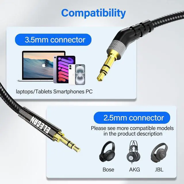 Compatibility: The 2.5 mm connector is compatible with Bose series headphones such as Bose On-Ear2 OE2 OE2i QuietComfort QC25 QC35 QC35II QC45 700 SoundLink SoundTrue and JBL E45BT E55BT E65BTNC as well as other Bluetooth headphones. The 3.5 mm connector is compatible with Android phones MP3 players tablets laptops and more2-Year