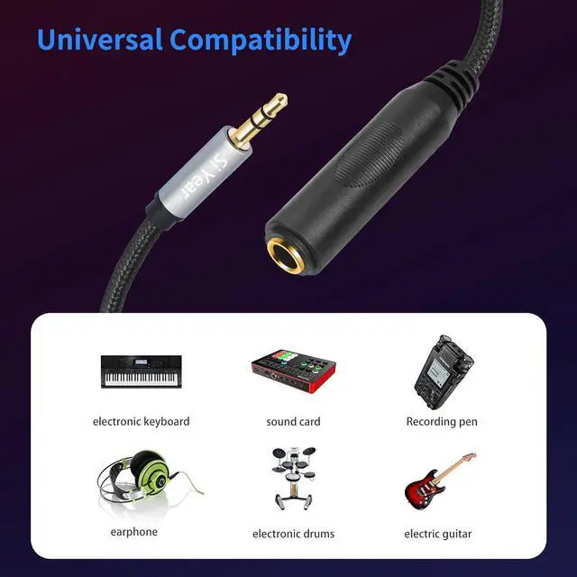 3.5 mm to 1/4 Headphone Extension Cable 3.5 mm male to 6.35 female Stereo Jack audio adapter cable is designed to connect amplifiers mixers home theater equipment or AV receivers with standard 1/4 inch plugs to 1/8 inch stereo jacks to make your favorite headphones or smartphones tablets iPods or headphones. This is convenient and cost effective stereo audio extension cableWidely Compatible Electronic keyboard Audio mixer amplifiers electric guitar/piano stereo system mixing console home audio home theater devices or AV receivers with a 6.35 mm 1/4 stereo jackNoteThis cable is a 3.5 mm to 1/4 cable not a 1/4 to 1/4 cable or 1/8 to 1/8 cable 1/8 to 1/4 stereo cable connects your smartphones iPod tablets laptop or another device with a 3.5 mm jack to a guitar mixing console home theater devices and amplifiers with a 6.35 mm jackPlug and Play 3.5 mm to 6.35 mmTRS cable with 24AWG oxygen-free copper (OFC) center conductor enhances signal transmission; High-quality one-piece 24k gold-plated connectors ensure efficient sound transmission.