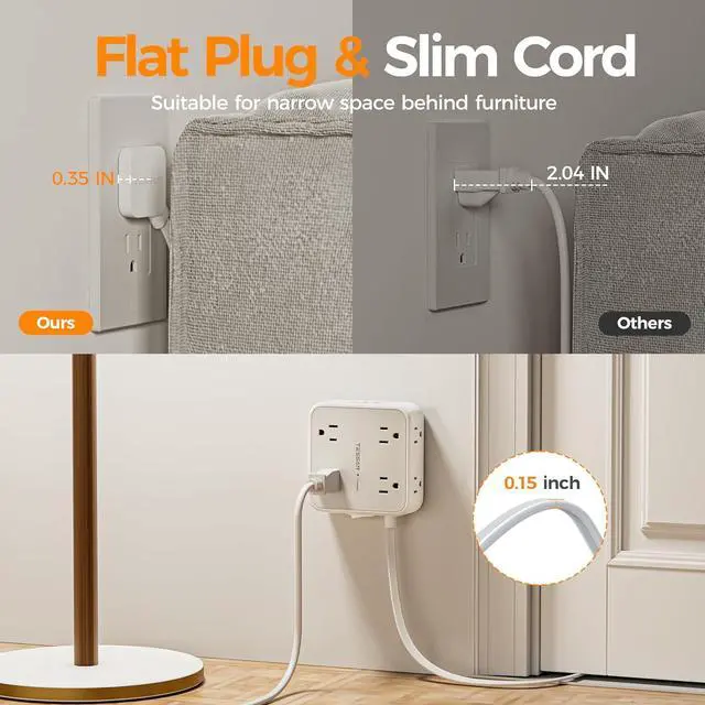 Cord Flat Wall Plug: This flat plug power strip 5 ft easily reaches distant outlets without excess length on the floor; 0.15 inch thick flat cord fits through door gaps and under carpet; 45 degree right angle design doesn't block the outlet below1 USB C and 2