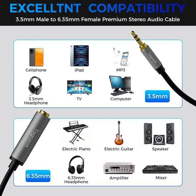 Audio Adapter: Togconn 1/8 Inch male to 1/4 Inch female headphone adapter cable is designed for transferring audio between 3.5 mm devices and 6.35 mm devices. You can use the adapter for the following scenarios: piano to 3.5 adapter 3.5 mm speaker adapter guitar to speaker adapter 6.35 headphone to computer adapter amplifier to headphones and more.