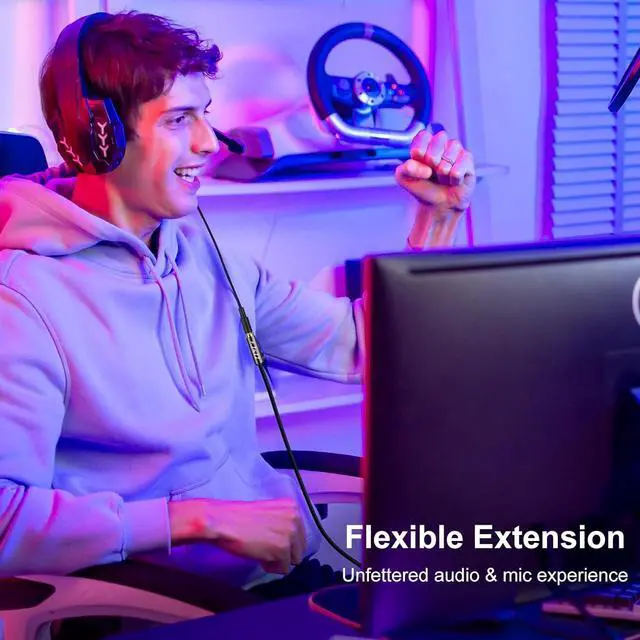 Compatibility: the male-to-female 3.5 mm audio cable with its ultra-slim aux plugs ensures a secure fit with standard aux port devices like TVs headsets speakers amplifiers sound systems external 3.5 mm microphones laptops tablets; compatible with MacBook compatible with iMac compatible with iPod compatible with iPad compatible with Switch Lite compatible with Xbox One/360 compatible with PS5 controller MP3/MP4 portable CD player DVD player and smartphone with a 3.5 mm jackConvenience and