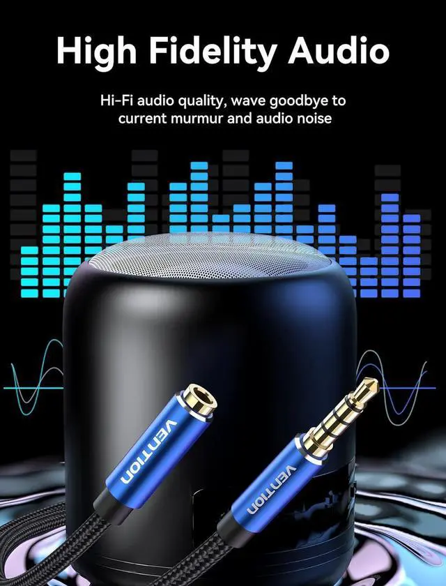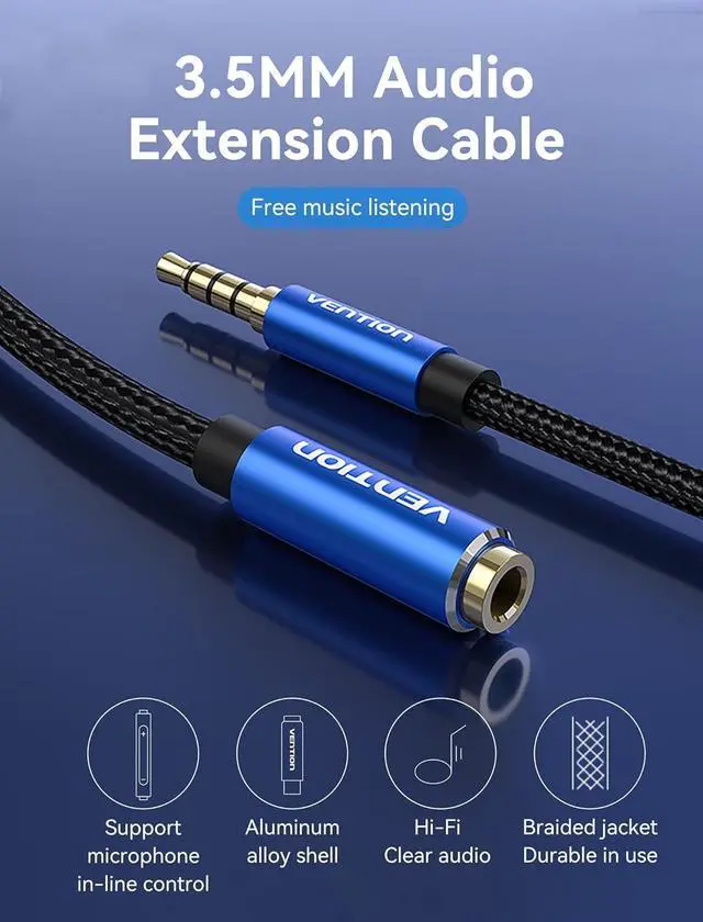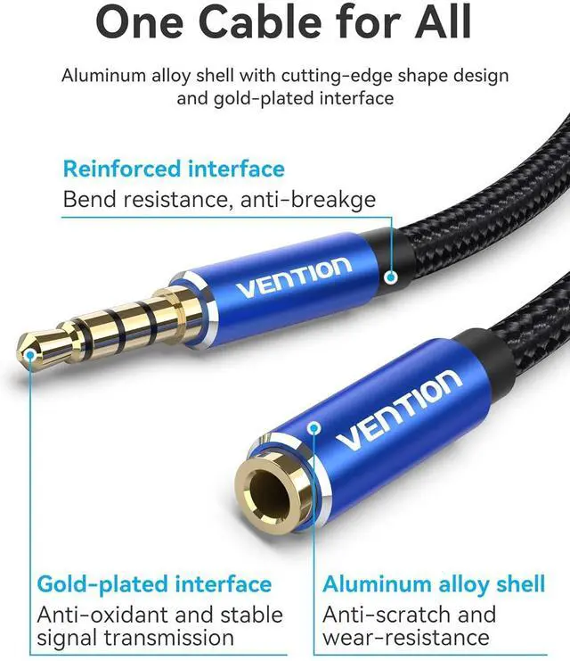 Universal Compatibility: The Vention 3.5 mm headphone extension cable works with any standard 3.5 mm audio jack. It's compatible with a wide range of devices. Our aux extension cable helps protect your original audio port from damage caused by repeated plugging and unplugging. No need to remove your phone case or insert forcefully. The metal plug enhances the strength of the connector preventing the stress point from falling off.