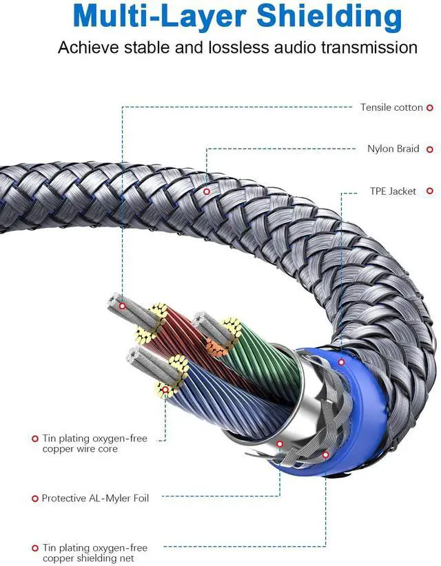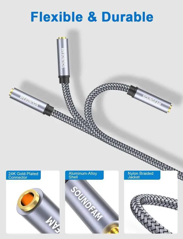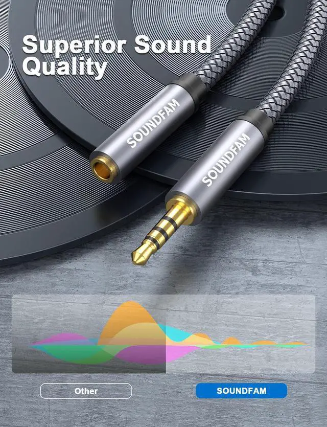 Tip: 4-Pole (TRRS) AUX Cable is not a complete substitute for Class 3-Pole (TRS) aux cable. ]Superior Sound Quality>Use 24K gold-plated connectors ensure reliability and eliminate signal loss and noise possible. Enameled copper wires provide the best conductivity and perfectly transmit sounds from your music player to headphones or speaker. No static or interference like wireless connectiondelivers clear and reliable sound to your audio device. Super-Durable & Tangle Free>SOUNDFAM audio extension cables have a soft braided nylon jacket that effectively prevents audio auxiliary cables from bending or twisting into messy tangles plus a super durable 10 000+ bend life. The gold-plated connectors avoid oxidation and corrosionprovide you with a durable use experience. Thoughtful Design>This 3.5 mm male to female extension cable is a great solution to protect your 3.5 mm auxiliary port device from being damaged by repeated plugging and unplugging. Slim connector fits in almost all smartphone cases (except life proof case). Step-down design ensures firm connection and smooth plugging and unplugging experience.
