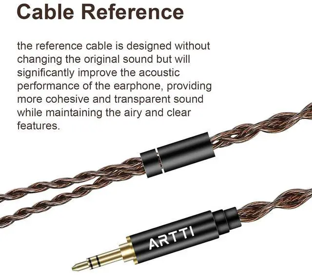 ARTTI A1 IEM cableThe A1 is built with a single crystal copper core and features four cores with 48 wires per core. ARTTI A1 cable is designed to minimize signal distortion and produces a smoother transition between high and low frequencies resulting in more natural and flexible sound. Multiple Choices Widely CompatibleTo adapt to various earphones the ARTTI A1 cable is designed with optional 3.5 mm plug 4.4 mm plug and optional mainstream 0.78 2-pin MMCX connector. PVC Shell Soft and Non-TangleThe cable shell is crafted from PVC a material that boasts remarkable durability and flexibility.