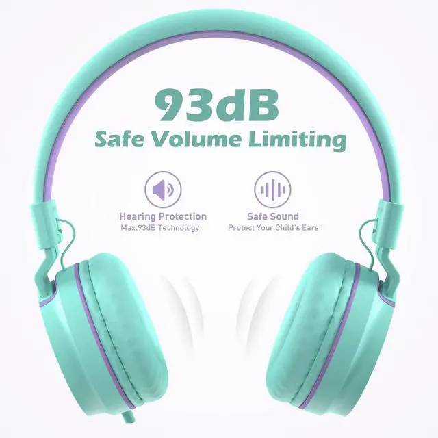 Kids Headphones, On-Ear Headphones for School, 93dB HD Mic Stereo Headphone for Kid Girls Children, Foldable Wired 3.5mm for Chromebook, Laptop, Computer, Tablet (Green Purple)