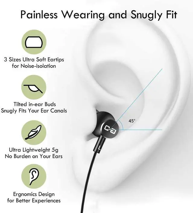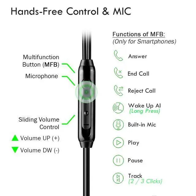 UPDATED 2021: Based on user feedback, important improvements have been made: 1) The buds have been redesigned from straight to a tilted shape for secure wearing, preventing them from falling off! 2) The microphone and hands-free button are built-in for great convenience. 3) The length of the coiled cord has been increased by 50cm (20 inches) longer, easily extending to 12 feet.