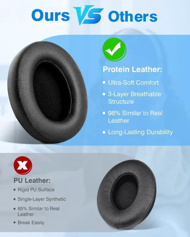 PREMIUM MATERIAL: Replacement earpads made of high-quality professional-grade protein leather ear cushions designed for long-term crack-free usage. Wear comfortably like original earpads. We also added stitching and durable glue inside each ear cushion.