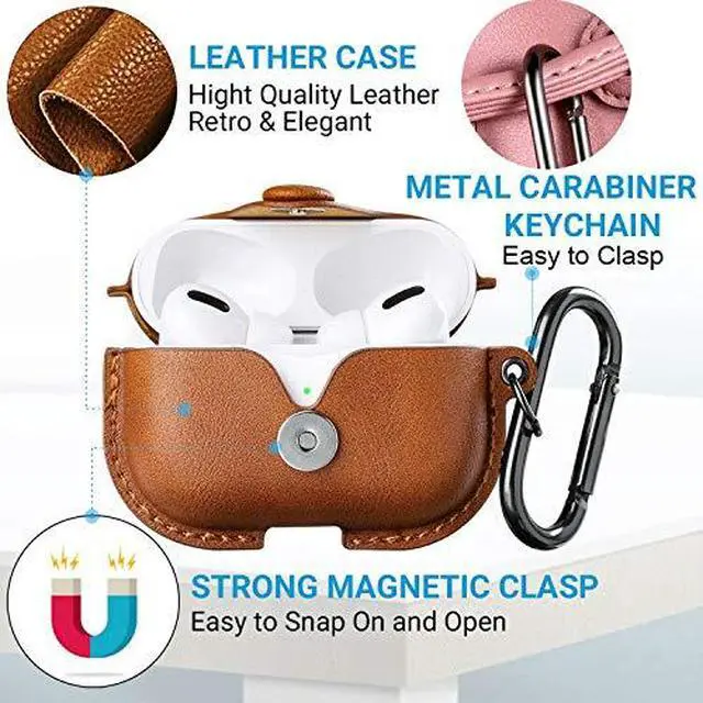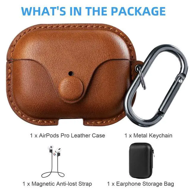 Package includes: 1 AirPods Pro Leather Case for AirPods Pro 2019/ Pro 2 2022/2023 + 1 Metal Carabiner Keychain + 1 Magnet Anti-lost Strap + 1 AirPods Pro/ Pro 2 Zippered Storage Bag.