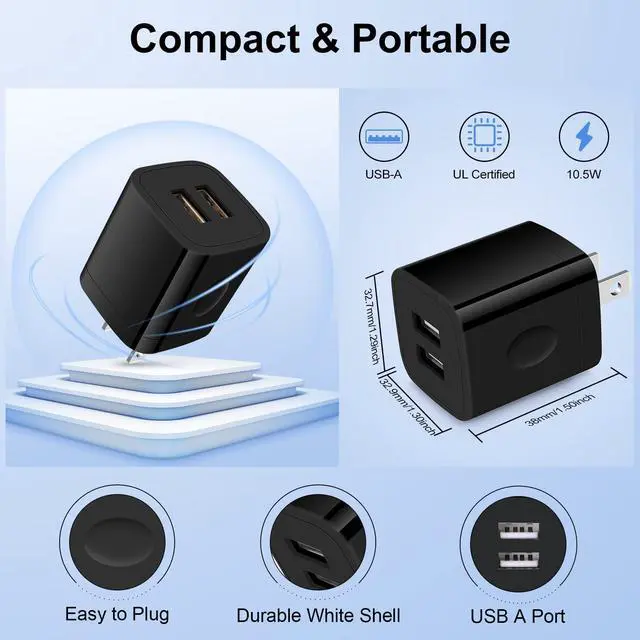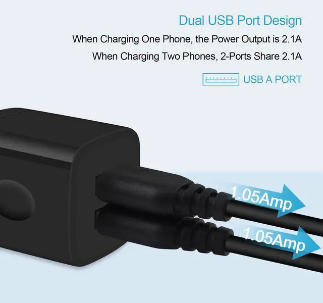 Powerful Charging Brick - Dual Port USB Charger total output 2.1Amps, input applicable to 110-240V global wide voltage, allows you to charge any 2 smartphones simultaneously at maximum speed. NonoUV charging cube with upgraded smart IC tech can automatically reallocate the most efficient charging current and charging speed for your phones and tablets, charges 50% faster than 5W charger.