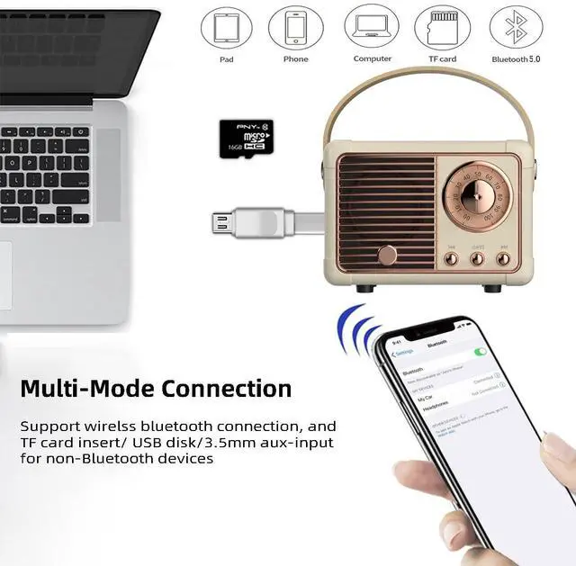 Strong Compatibility Bluetooth 5.0 solution provides more efficient and stable wireless transmission with strong anti-interference, compatible with Android and iOS devices. Enjoy long bike rides, watch TV shows, or stream movies for hours, or listen to an audiobook while you work around the houseall wirelessly and without interruption. This retro bluetooth speaker also supports TF card and USB disk.