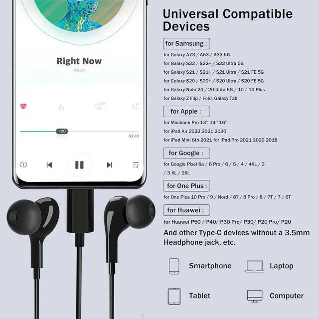 Wide CompatibilityThese USB C earbuds work with all Type C devices without a 3.5 mm jack, including iPhone 15/15 Plus/15 Pro/16 Pro Max 17/17 Pro Max, iPad 10, iPad Pro/Mini 6/Air, Samsung Galaxy Z Flip/Fold/Note, S25/S25+/S25 Ultra, S24 FE/S24/S24+/S24 Ultra, S23 FE/S23/S23+/S23 Ultra, A74/A56/A55/A53/A54/A35/A16, S22/S22+/S22 Ultra, S21 FE/S21/S21+/S21 Ultra, Pixel 8 Pro 7a 76a 6 5, One Plus 10T/10 Pro/9/Nord/8T/8/7T/7/6T, and headphones for Android phones and tablets with Type C audio.