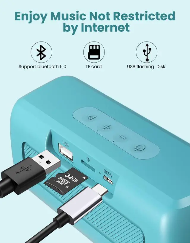 Multiple Playback ModesBluetooth 5.0 technology supports most devices, such as iPhone, Samsung, and Android cellphones. Also supports USB flash drive and micro SD card (up to 32GB) playback.