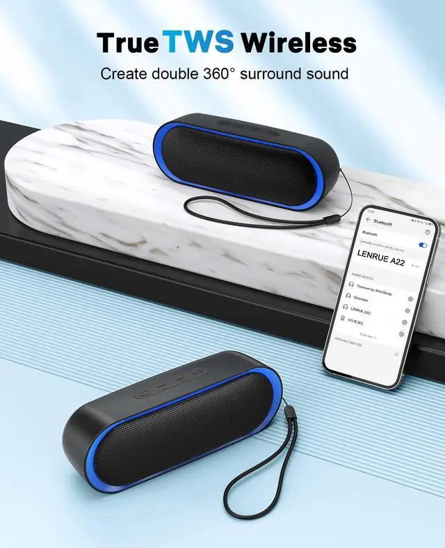 IPX6 Waterproof - Portable Bluetooth speakers feature IPX6 waterproof and dustproof, making them suitable for shower, pool, and beach use. The speaker cannot be completely immersed in water.