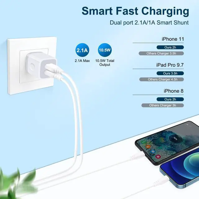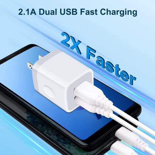 2-Port Fast Charger Plug - The 2.1A Dual Port USB Charger Block provides an output of 5V/2.1A (total max), which is 2X FASTER charging than the conventional 5V/1A plug chargers. It can fully charge compatible devices in just about 2 hours. With two ports available, it allows convenient charging for 2 devices simultaneously.