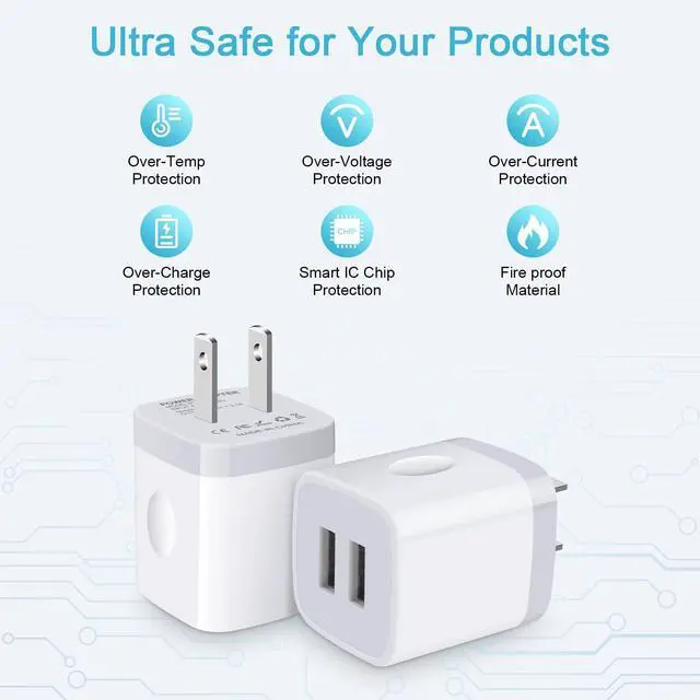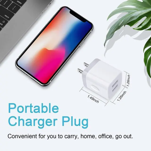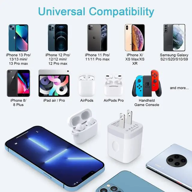 Universal Compatibility - This Dual USB Charger Plug Power Adapter is compatible with various devices including iPhone 15/15 Plus/15 Pro/15 Pro Max/14/14 Plus/14 Pro/14 Pro Max/13/13 Mini/13 Pro/13 Pro Max/12/12 Pro/12 Pro Max/12 Mini/SE 2020/SE 2022/11/11 Pro/11 Pro Max/XR/XS/X/8/7/iPad Air 2020, Samsung Galaxy models from S23 to A14 and many others, including Google Pixel and more.