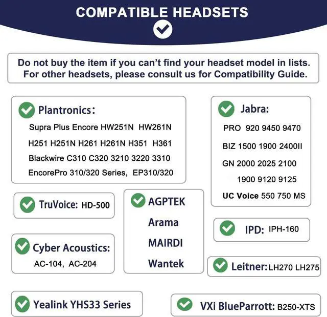 COMPATIBLE MODELS: NOT for Jabra Evolve 20 30 40 65 75 and Evolve2 Series. ONLY COMPATIBLE WITH SOME SPECIFIC HEADSET MODELS LISTED IN DESCRIPTION. Some specific models from Plantronics Supra Plus Encore HW251N HW261N HW510 HW520 Blackwire C225 C310 C320 3210 3220 3310 3320 3315 3325 and Jabra PRO 920 930 9450 9460 9465 9470 BIZ 620 1100 1500 1900 2400II GN 1900 2000 2100 2025 9120 9125 UC Voice 550 750, etc. For other headsets, please contact us for Compatibility Guide.