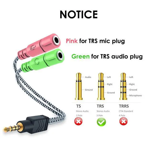 3 Connection Ways: Two 3.5mm female ports for a double-plug headset, one TRS mic + one TRS headphone, one TRS mic + one TRS speaker. NOTICE: It doesn't work for 3-pole TRS condenser microphones or 4-pole TRRS external microphones.