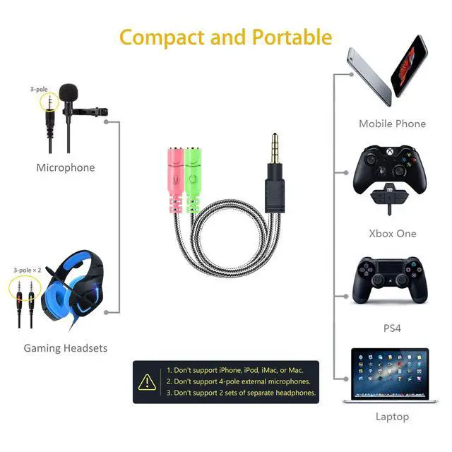 Universal Compatibility: This 3.5mm audio splitter for headphones and mic supports almost all currently popular audio devices. The 3.5mm male port is compatible with gaming consoles, PCs, smartphones, tablets, and laptops.