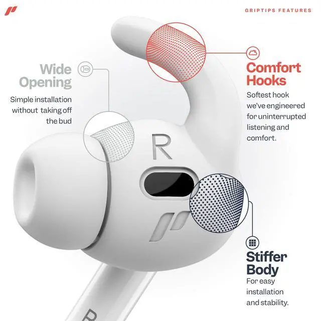 • Soft flexible hooks prevent AirPods Pro 2 from falling out of your ears.