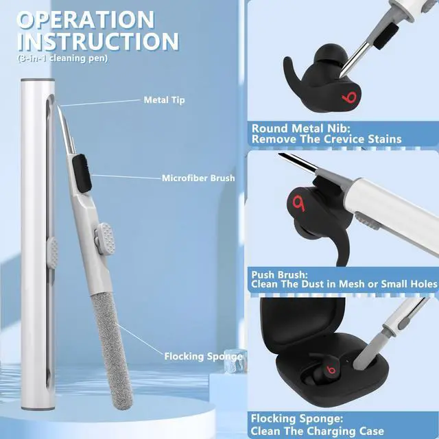 [Multifunctional cleaning pen]: Convenient 3-in-1 design, the cleaning pen tip is made of metal, which can clean small holes in earplugs, deeply clean gaps, and stubborn dirt. A soft Microfiber brush under the pen tip can easily brush off the small parts of the headset surface. A cleaning pen can meet the cleaning needs of many occasions. Applicable to earphones, Bluetooth earphones, mobile phones, tablets, computers, and digital products such as cameras.