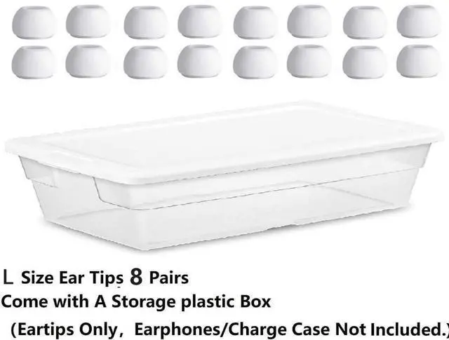 Package includes: 8 pairs of ear tips (large size) and a plastic box for ear tips (ear tips only, earphones/charge case not included).