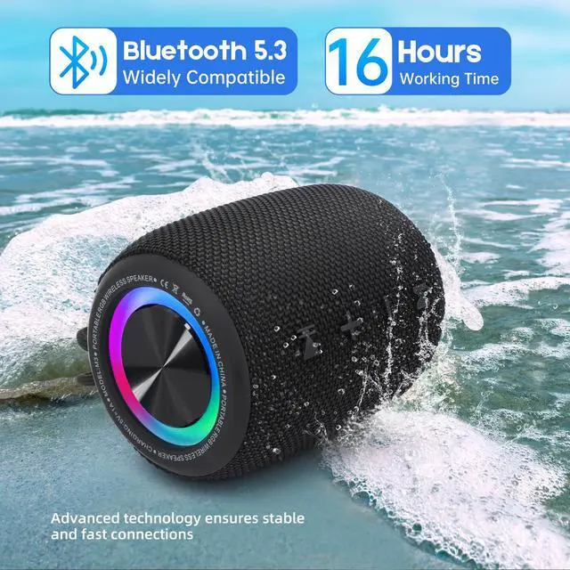 Portable Speaker, BT5.3 Wireless Speaker 20W Bass Diaphragms with Multi LED Light Dynamic Modes, IPX6 Waterproof 16H Playtime supports FM Mode, TF, USB for Home, Cycling, Outdoor, Beach