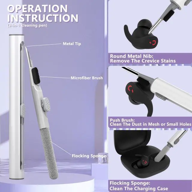 [Multifunctional cleaning pen]: Convenient 3-in-1 design, the cleaning pen tip is made of metal, which can clean small holes in earplugs, deeply clean gaps, and remove stubborn dirt. A soft microfiber brush under the pen tip easily brushes off small parts of the headset surface. This cleaning pen meets the cleaning needs of many occasions and is applicable to earphones, Bluetooth earphones, mobile phones, tablets, computers, and digital products such as cameras.