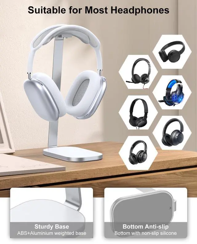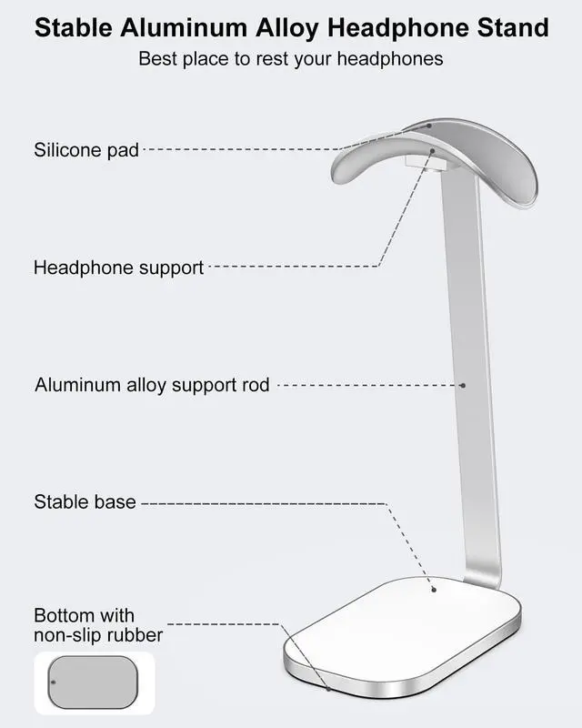 Sturdy Aluminum Alloy Stand: The headphone stand is composed of an aluminum alloy support rod, headset support, and an aluminum + ABS base with a non-slip silicone bottom. Provides stable support for your headphones. Please note: This version does not support wireless charging.