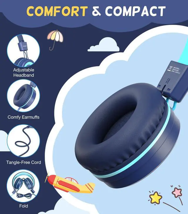 Foldable & ComfortableThese headphones feature super soft and breathable ear cushions for effective isolation from ambient noise. With a multi-angle rotatable design and adjustable headband, they offer a perfect fit for your child's head shape. The retractable feature allows for easy adjustment to fit various head sizes.