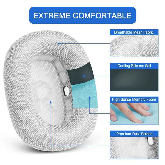 [Premium Mesh Material] The replacement ear cushions for AirPods Max headphones are made of premium mesh fabric, which lasts longer than leather material. They feature silicone gel under the mesh layer, making them more comfortable to wear and resistant to sweat, ensuring comfort for extended listening sessions.