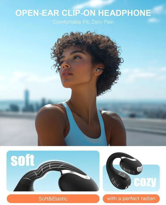 Open Ear Clip Wireless Earbuds Bluetooth 5.4, Lightweight Comfort Sports Bone Conduction Headphones Built-in Mic for Clear Audio, Stable Fit Earphones 24H Play